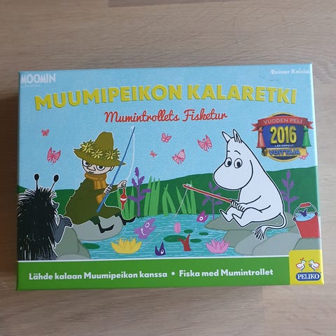 Pienten lasten ensipeliksikin sopiva palkittu peli, Muumipeikon kalaretki. Itse peli hyvässä kunnossa, mutta laatikkoa on teipattu yhdeltä sivulta. Kaikki osat tallella.