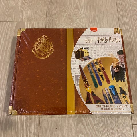 Iso setti Harry Potter puuhaa ja väritettävää: origamikirja, väritettäviä kortteja kahta eri kokoa, kirjepaperi- ja kuorisetti sekä 2 värityskirjaa.