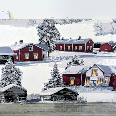Vallilan Muisto kankaasta tehty valotaulu. Kehykset tukevaa puuta. Taulun koko 140 x 75 cm. Nouto.