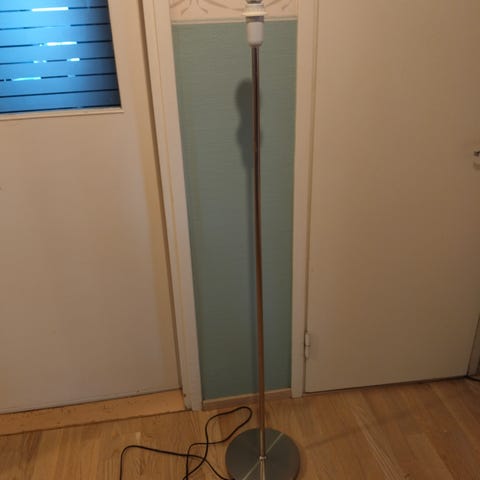 Annetaan krominen jalkalamppu. Jalassa muutama kolhu. Toimii ja pysyy pystyssä.