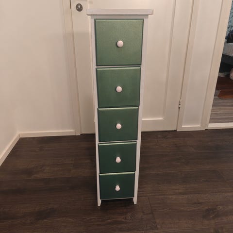 Puinen lipasto valkoisilla ovilla ja laatikoilla