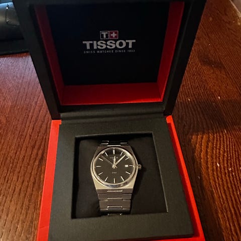 Saatu lahjaksi 2025, siksi ei kuittia. Tissot Classic Dream Swissmatic ref T129.407.11.051.00. Mukaan alkuperäinen teräsranneke ja loistokunnossa oleva tarvike -nahkaranneke. Oma ranne noin 20cm, ja teräsrannekkeeseen mukaan yksi jatkopala.