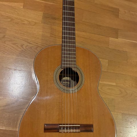 Landola akustinen kitara, klassinen malli, luonnonvärinen kansi ja punainen runko. Sopii akustiseen soittoon. Ja mukaan saa kitaratelineen.
