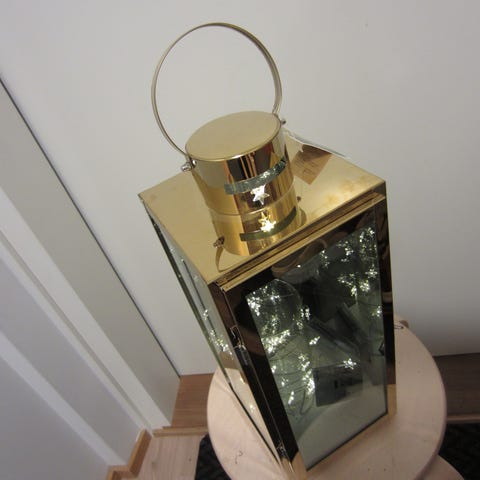 Kromin värinen, upea ja käyttämätön lyhty, jossa on lasiseinät ja nahkainen kantokahva.