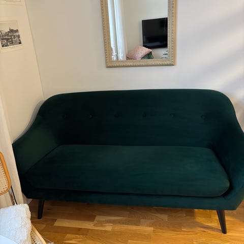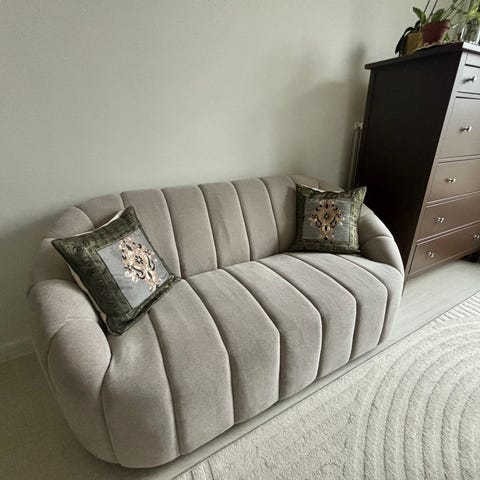Myydään vaalea/beige sohva, hyvää paksua kangasta sekä ryhdikäs kaikin puolin.