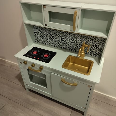 Hyväkuntoinen alkuperäisessä kunnossa oleva IKEAn leikkikeittiö. Levyjen valot toimii, patterit vastikään uusittu. Ovessa pienen pieni jälki, näkyy kuvassa kun oikein tsoomailee.