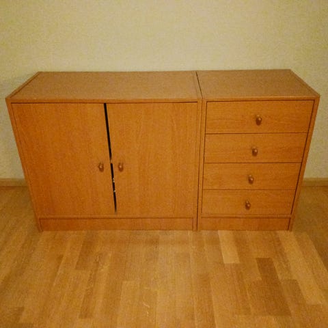 Lukollinen kaappi. Värinä kirsikka, Martela tuotantoa. Sivussa jälkiä (kuva).