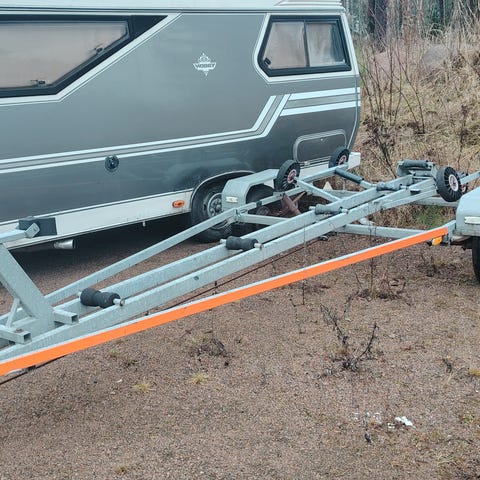 Kokonaispano 2000 kg. Kantavuus 1500 kg. Uudet renkaat. Sopii n. 19 jalkaiselle veneelle.