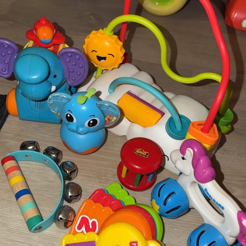 17 kappaleen kokoelma erilaisia vauvan leluja: helistimiä, puruleluja, ääntävä mobile (rattaisiin/autoon), ääntävä ja purtava ”avainnippu” yms.