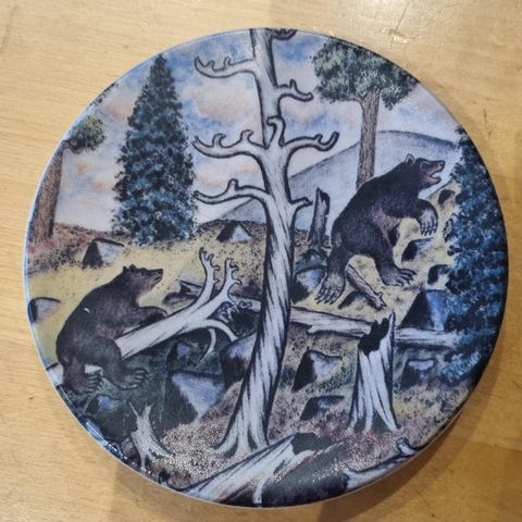 Arabian seinälautanen, jossa on kuva Karhu Lapin erämaassa, suunnittelijana Andreas Alariesto. Halkaisija 22,5cm.