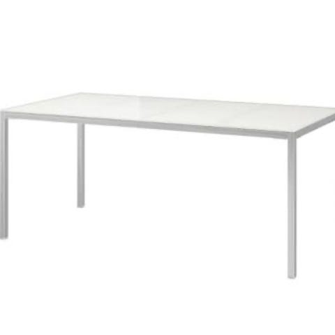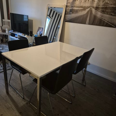Valkoinen korkeakiilto Ikea Torsby pöytä tukevalla kromirungolla, 6-8 hengelle.