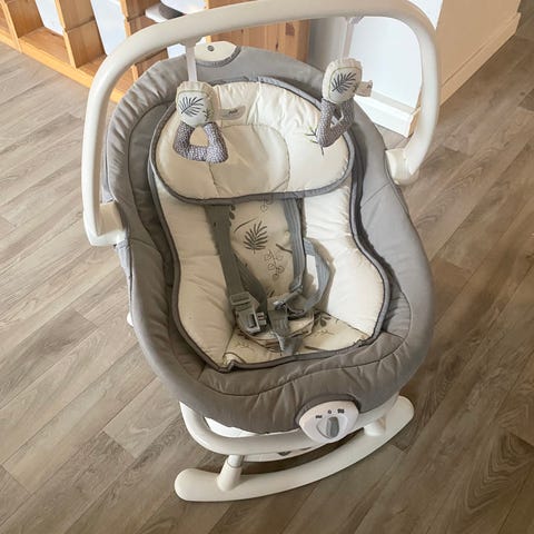 Joie Sansa 2in1 keinu tai sitteri. Keinutusominaisuudet telakan avulla (sähköjohto mukana) tai sitterinä ilman telakkaa täriominaisuudella (paristot). Keinussa on pehmustettu istuin ja turvavyöt.