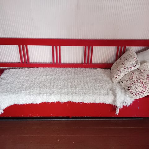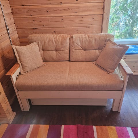 Levitettävä puusohva vuodevaatelaatikolla, patjat mukaan tarvittaessa.