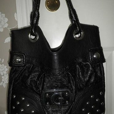 Musta kiiltävä ’nahka’ ja ihana yksityiskohtainen solki edessä: nahka pysynyt täydellisessä kunnossa ja myös soljessa kaikki timantit paikallaan eikä naarmuja. Sisäpuoli on myös täysin kunnossa.