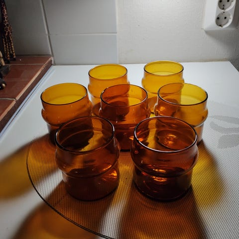Humppila talonpoika lasit ja kulhot. Kauniit ruskeat astiat.