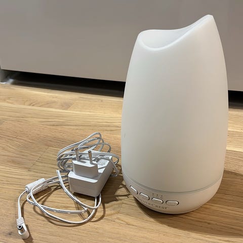 SilverCrest diffuuseri valkoisella värillä. Laitteessa on useita painikkeita ja mukana tulee virtalähde. Sopii ilman kosteuttamiseen ja hajusteiden levittämiseen. Valo, varinvaihto seka ajastin ominaisuudet.
