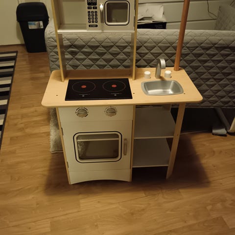 Puinen leikkikeittiö, jossa on uuni, mikroaaltouuni, liesi ja kaappi. Monivärinen ja sopii lasten leikkeihin.