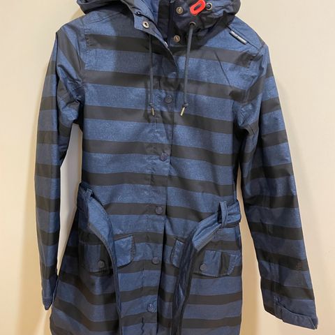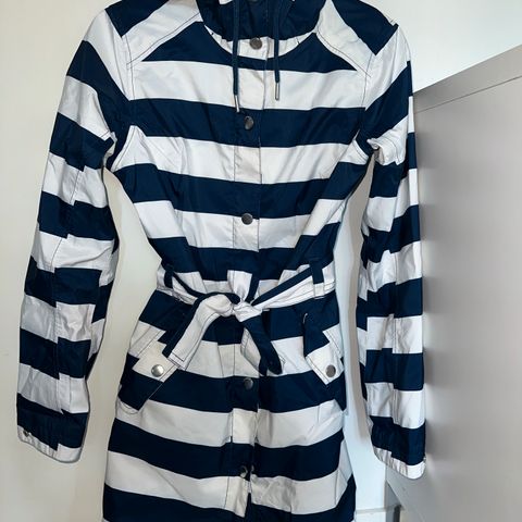 Uusi, laput kiinni. Veikeä läpikuultava sadetakki, jossa trenssin leikkaus. Osa kankaasta kuvioitu pitsimäisillä pienillä lumihiutaleilla, osa yksiväristä valkoista läpikuultavaa. Kauniit kuparinväriset nepparit, hihansuiden tiukkuus myös säädettävissä näillä neppareille (kuvissa säätö keskiasennossa).