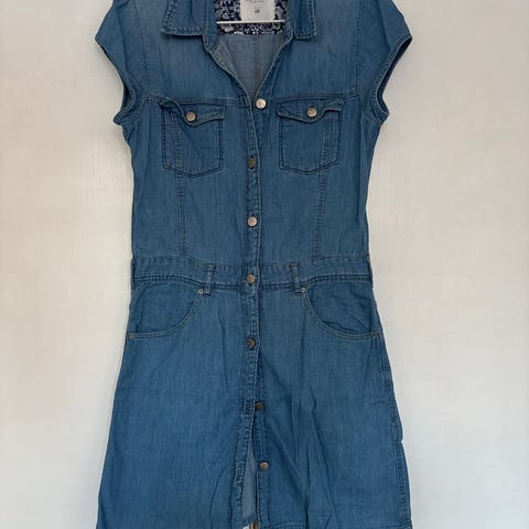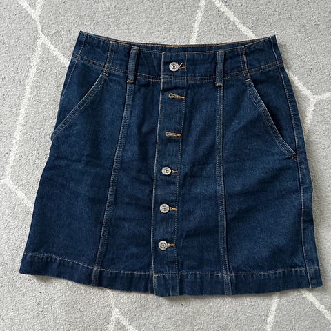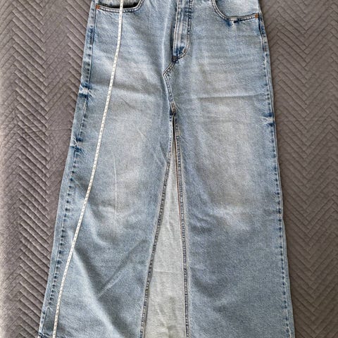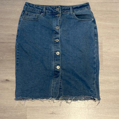 Jeans denimhame sinisessä värissä. Hame on valmistettu denim-materiaalista ja siinä on kulutettu ilme. Etupuolella on vetoketju ja napitus. Hameessa on taskut sekä edessä että takana. Hameen helma on hieman rispaantunut. Malliltaan suora ja pitkä hame.