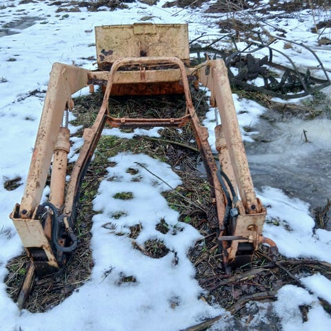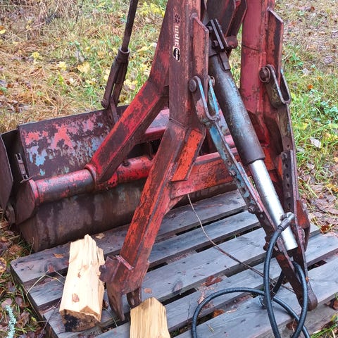 Etukuormain, ollut ilmeisesti takaveto traktorissa. Ei sovitteita, yksitoimset sylinterit, kauhan kippaus mekaaninen.
