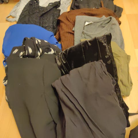 - H&M harmaansininen laskostettu mekko, koko S. Vyötäröllä nauha. Metalliosissa värimuutosta.