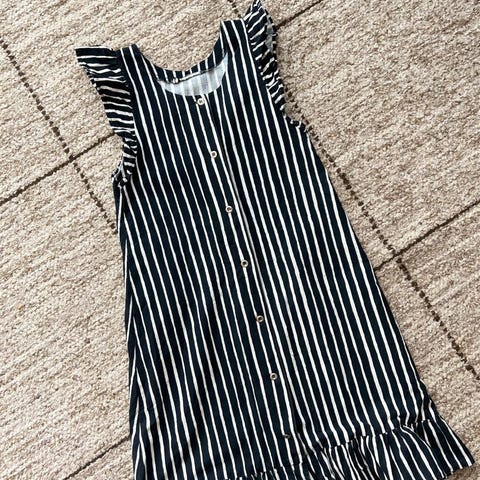 Puna-beigeraidallinen essumekko. Vanhaa tuotantoa, paksua puuvillaa. Hyväkuntoinen. Koko vastaa nykyistä S-kokoa. Voi käyttää napit edessä tai takana, vyöllä tai ilman. Taskut, kuten kuvista näkyy.