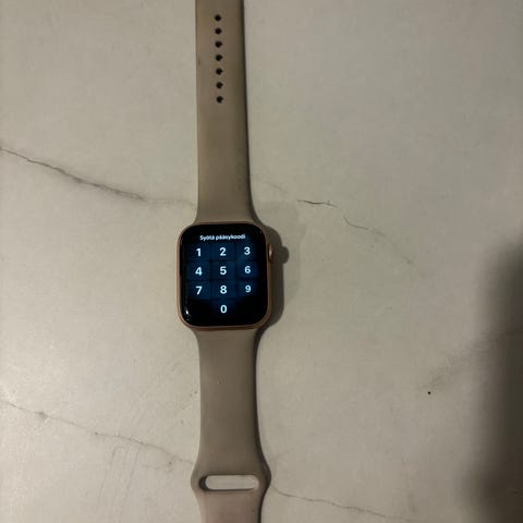 Apple Watch Series 4 älykello, jossa valkoinen silikoninen ranneke koko S/M. Näytössä jo enemmän elämän jälkiä, mutta toimii edelleen!