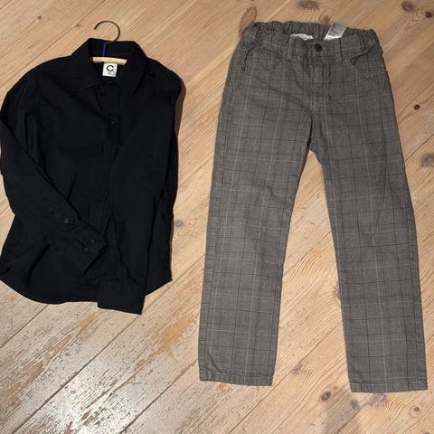 Juhla-asu pojalle koko 128-134 cm. Sisältää valkoisen kauluspaidan, mustat suorat housut ja samettisen puvun takin.