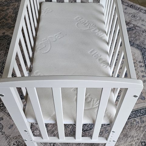 Mukaan patja, 2 korotuspatjaa, toisessa sivutuet (irroitettavat), kiinnitysnauha sänkyyn (toinen pää solmittu).