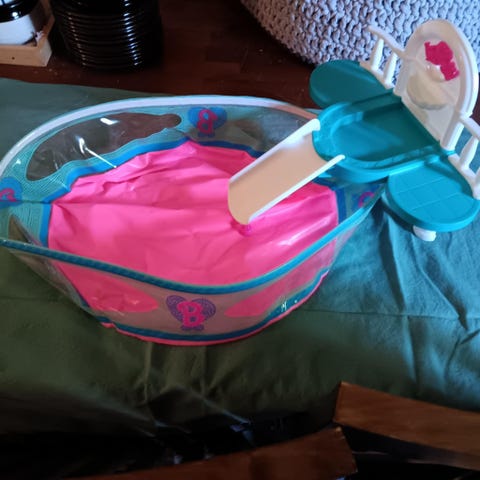 Siisti ja ehjä. Erillisen muoviseinän toinen pieni kiinnike katkennut, pysyy kahden muun kiinnikkeen avulla paikallaan. Patterikotelo siisti, en testannut toimiiko kuplatoiminto pattereilla. Mukaan pieniä Barbien tarvikkeita, esim hiusharja ja peili.