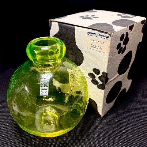 Alkuperäinen Riihimäen Lasi -tehdaslaatikko mukana