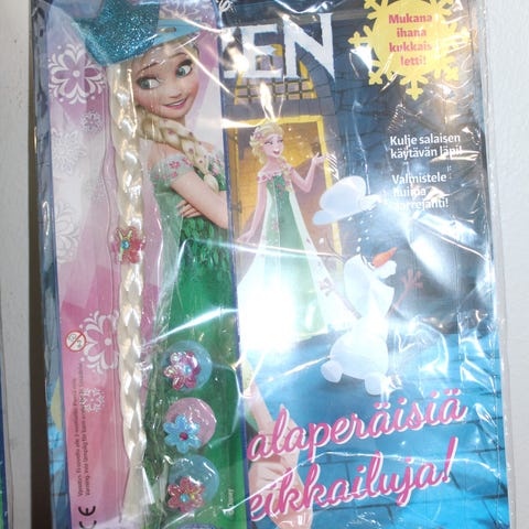 Lelusetti. Sisältää Frozen Anna ja Elsa hahmot, pop-it, "stressi lelun", barbin/ponin kampoja yms