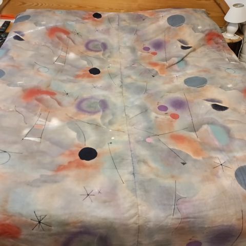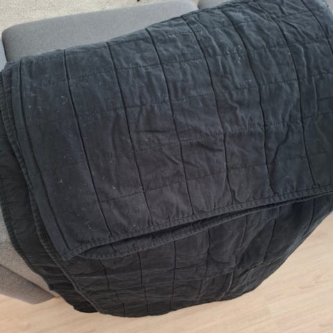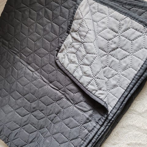 Tikkikankainen harmaa päiväpeitto ja kaksi koristetyynyn vetoketjullista päällistä.