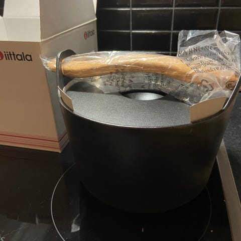 Sarpanevan iso valurautapata, Iittala. Pieni roso sisäpinnan emaloinnissa, ks. kuva. Muutoin täysin siisti.