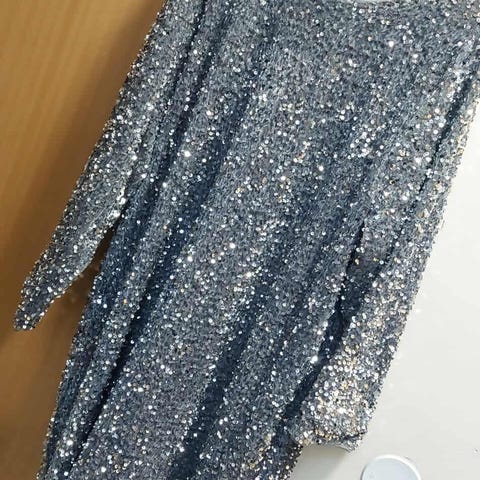Ohutta läpikuultavaa 100% polyesteriä. Tummanvihreällä pohjalla kullanvärisiä palloja. Puolipitkät hihat, kuminauhat hihansuissa. Kuminauha vyötäröleikkauksessa. Pituus olalta helmaan 120 cm. Koko Zizzin XL vastaa numerokokoa 54-56.