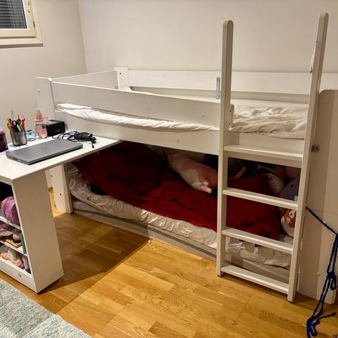 Myydään uutta vastaavassa kunnossa oleva Nukkumatti pikkupari + patja. Sänky on ollut vähäisellä käytöllä. Patja on laadukas ja paksu, 200cm x 80cm. Mukana siirrettävä hylly ja sängyssä kiinni oleva pöytä, jonka voi työntää osittain sängyn alle. Kuvaamisen jälkeen purettu ja kaikki osat ovat tallessa seuraavalle käyttäjälle. Hinta uutena 299€ + patja 80€.