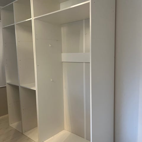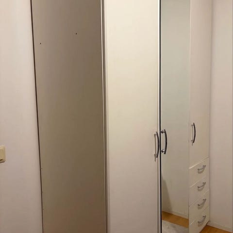 Vaatekaappi peiliovilla. Toisella puolella on vaatetanko ja hylly. Toisella puolella 4 hyllyä. Kaapin päädyssä on ollut koukut kiinni ja niistä jäljet (näkyy kuvissa). Toisessa päädyssä on pienistä tarrakiinnitteisistä koukuista jäänyt jälkiä. Voi ehkä rapsuttaa pois. Muuten kaappi on siisti ja tukeva.