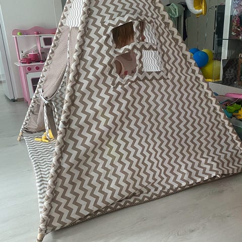 Etsysta hankittu lasten leikkimaja. Maja on ihana luonnonmukainen puuvillasta tehty pesä, jonka ovet ja ikkunan saa kiinni. Sen voi tarvittaessa pestä ja saa helposti myös kasaan.