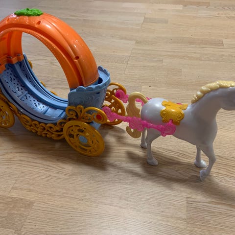 Kuvanmukainen hyväkuntoinen Barbien hevosvaunut vetoaisoineen.