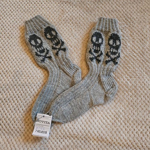 Myydään Novitan konepestävästä 7-veljestä langasta (80%villa / 20%polyamidi) käsin neulotut laadukkaat villasukat nro 44. Varsiosan mitta nilkan kohdalta sukan yläreunaan 19 cm. Sukkien kantapäät ovat vahvistetut (kaksinkertainen) ja muotoillut. Sukat pysyvät hyvin jalassa ja säilyttävät muotonsa.