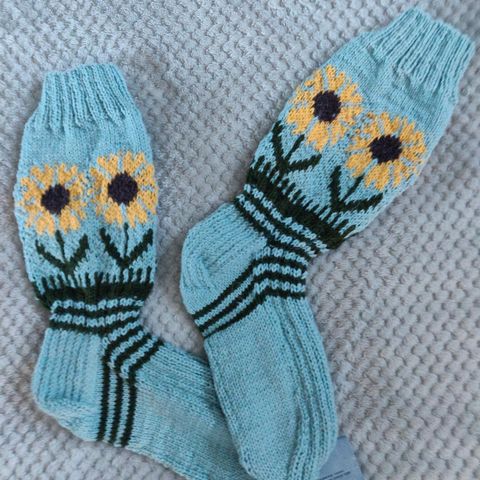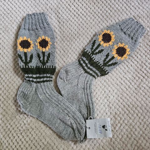 Käsin neulotut villasukat nro 41, varsissa auringonkukat