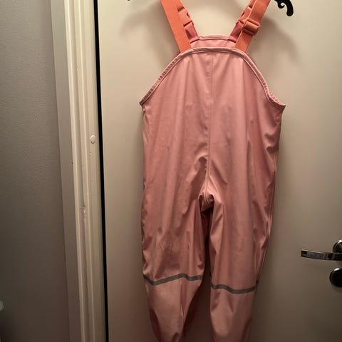 Todella hyvässä kunnossa kuravaatteet, takki ja housut henkseleillä. Väri oranssin ja vaaleanpunaisen väliltä.