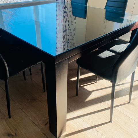 Hyväkuntoinen puinen ruokapöytä, jonka muoto ja pituus säädettävissä tarpeen mukaan.