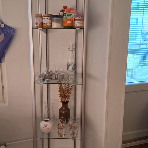 Hyvä kuntoinen lasinen kulmahyllykkö, jossa kolme säädettävää maitolasista hyllyä. Korkeus 65 cm, leveys 33 cm Nouto Halikko kk