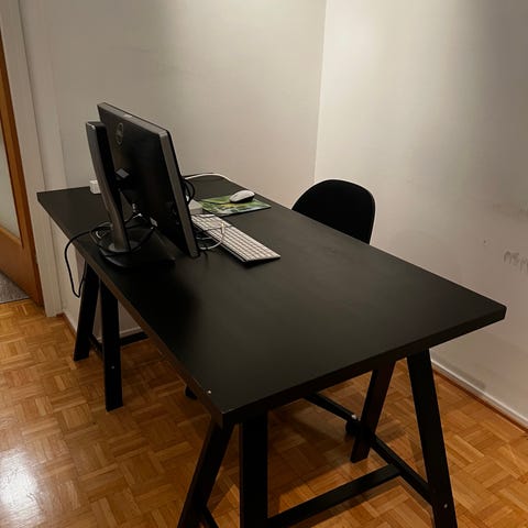 Ikea työpöytä, väri harmaa, mitat 120x60 cm. Pöytälevy on suorakaiteen muotoinen, ja pöydässä on neljä metallijalkaa. Soveltuu esimerkiksi työ- tai opiskelukäyttöön.