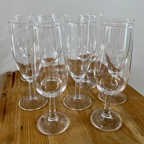 2 kappaletta 23 cm korkeaa 1.3 dl vetoista kuohuviinilasia yhteensä 8 €. Kuvassa oikealla on yksi tavanomainen kuohuviinilasi antamassa mittakaavaa myytäville 2 lasille, jotka ovat vahvempaa lasia ja korkeammat kuin normilasit.