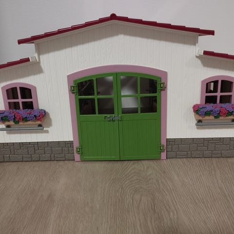 Erinomaissssa kunnossa oleva Schleich-talli. Tallin katon saa irrotettua sivuun leikkejä varten.