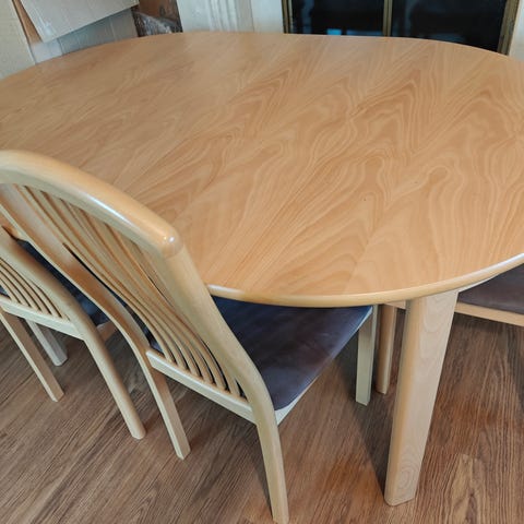 Tummanruskea isi pöytä ja kuusi ruskeaa tuolia