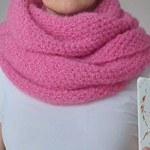 Drops Melody langasta neulottu tuubihuivi, väri vaaleansininen (värin nro 34). Menee kaulan ympärille kaksinkerroin, joustaa eikä kiristä. 71% alpakkaa, 25% villaa, 4% polyamidia.