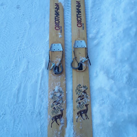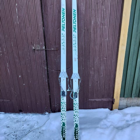 Eräsukset, jotka edellinen omistaja on tehnyt laskettelusuksista. Siteet uudenveroiset